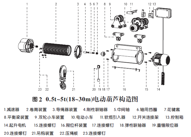 0.5~5 噸(起升高度 18 米以上)運行式電動葫蘆除上述部件外,再加裝平衡梁裝置及雙輪小車裝置。